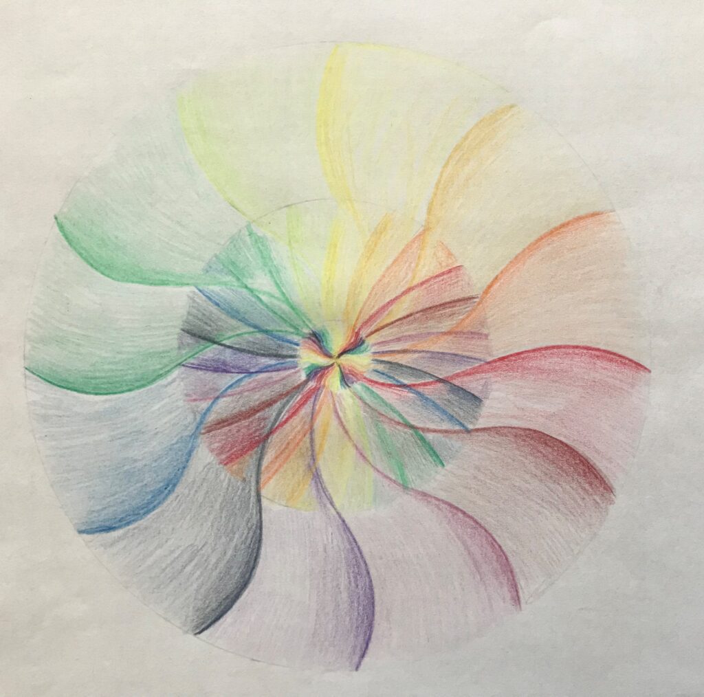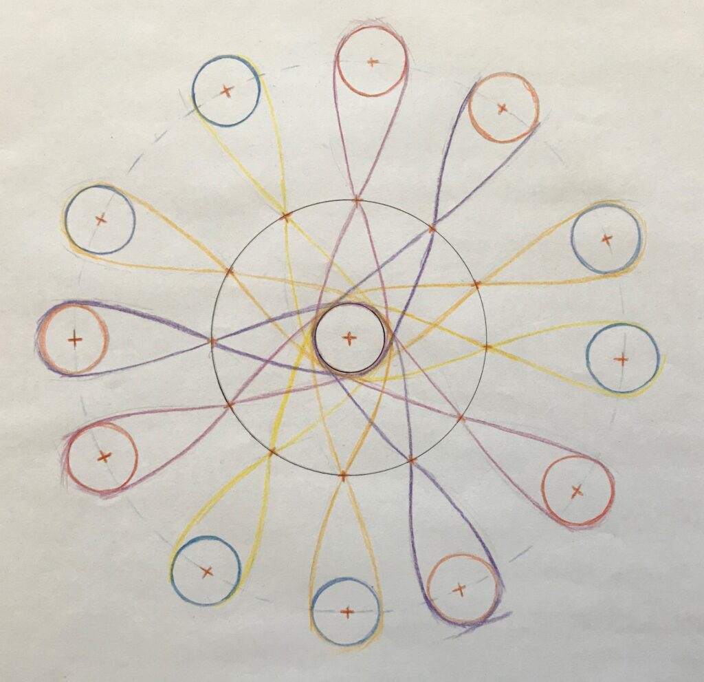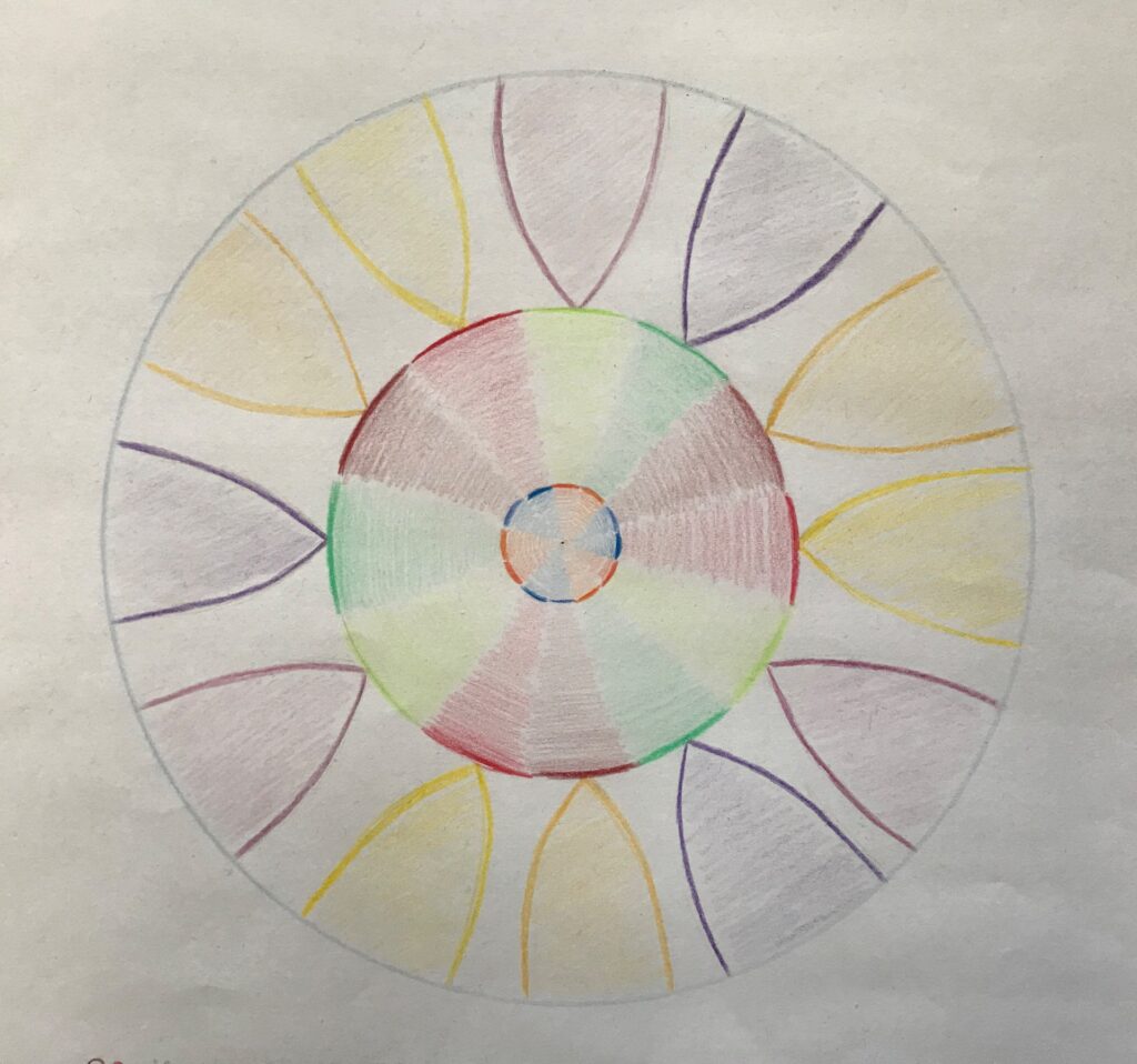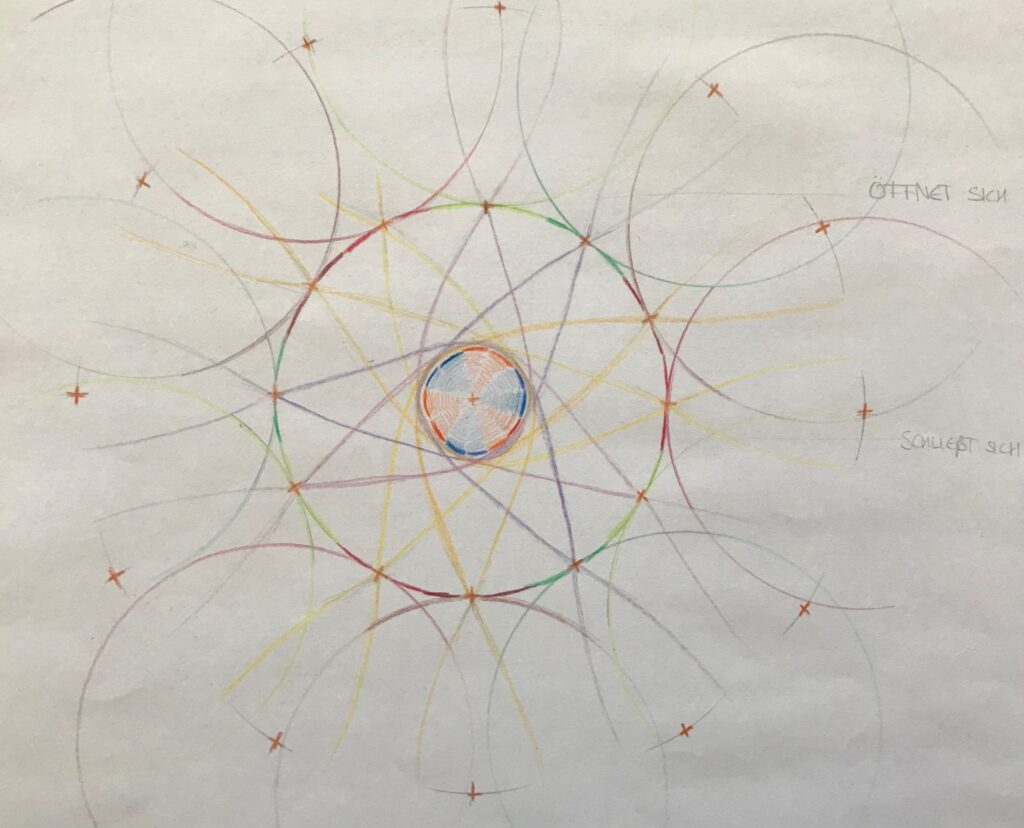 In einer meditativen Auseinandersetzung mit den körperlichen Sinnen (Sehen, Riechen, Hören, Schmecken, Tasten und Propriozeption) in Verbindung zur Herzenskraft wurde es möglich, verschiedene grundständige Netzwerkstrukturen aufzumalen.